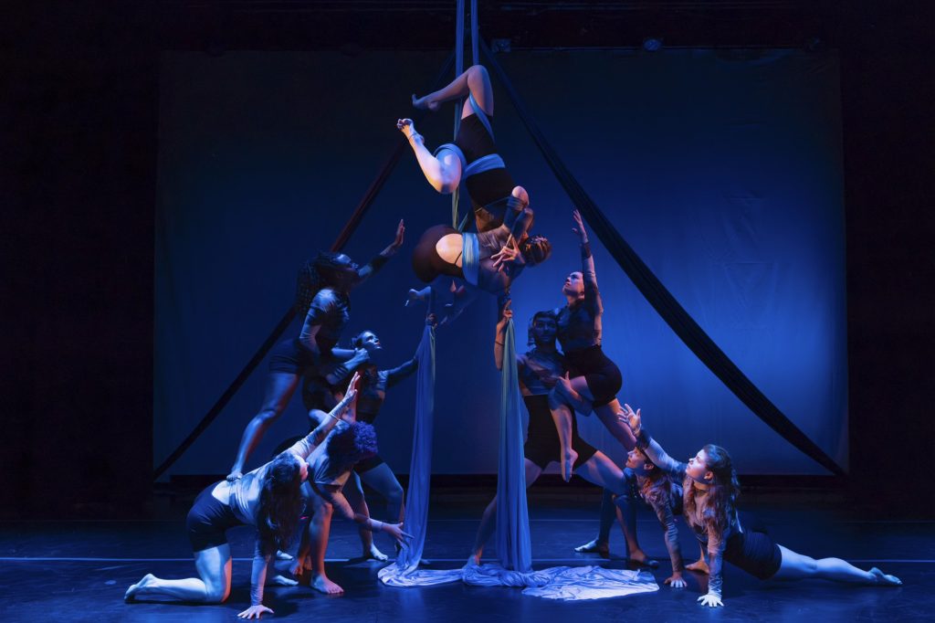Crux Collective performance. (photo by Andrea Wedig)Having established themselves over the past two years with sold-out shows of their first two premieres, Catalyst and Parallel, Crux Collective, a performing arts company that combines contemporary concert dance and circus arts to deliver acrobatic spectacle alongside artistic storytelling, returns this fall with Mutara. The creative team describes their new evening-length work, running at the Windmill Arts Center October 3 through October 12, as “a vignette-style performance exploring the mechanics and philosophy behind the concept of change in its many forms,” in which “time is not just a backdrop but a character who shapes and moves us, distorting us, [forcing] us to confront the paradox of predeterminism versus possibility.” The core collaborators of Crux Collective are all highly skilled aerialists, and the company’s performances involve interdisciplinary collaboration among local dancers, musicians and visual artists as well. For those patrons planning to see MOMIX’s Alice at the Fox Theater on October 25, Mutara promises another opportunity to experience athletically daring and aesthetically innovative movement-based art in the Windmill’s more intimate black-box setting (and at a more affordable price point). Crux Collective, Mutara, October 3-12, Windmill Arts Center. — Robin S. Wharton