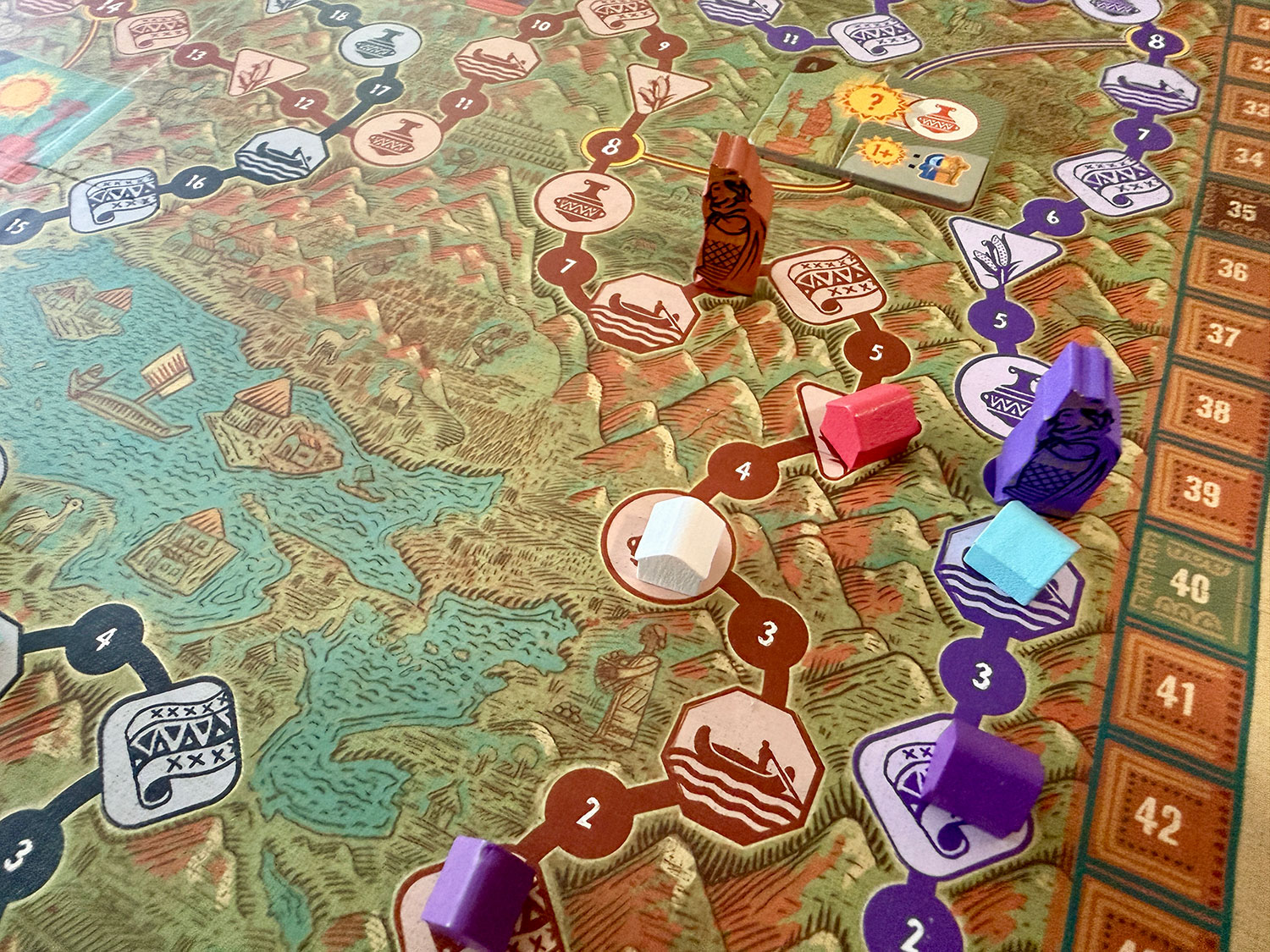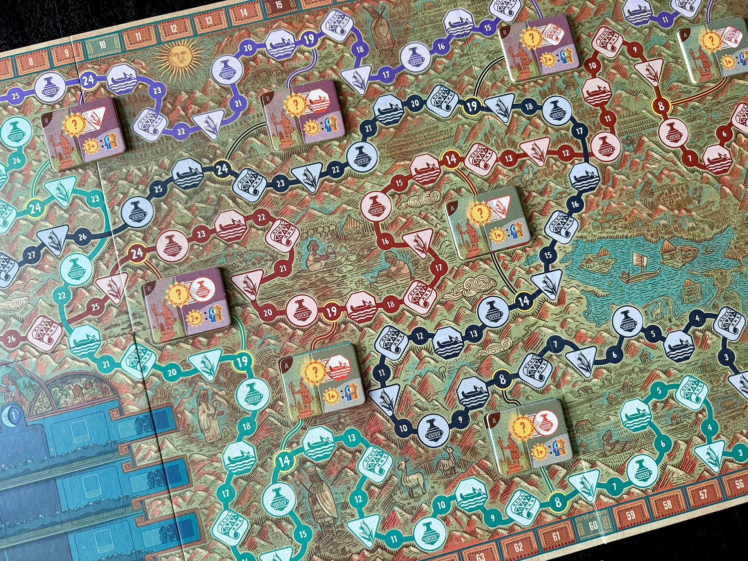Sitting down to Ayar finds players facing a main board with four distinct paths that each Ayar traverses. They begin at Lake Titicaca and converge on Cusco. These paths are filled with icons for one of four types of activities, as well as activity scoring Raymi tiles, should an Ayar reach them along the way. Player turns are frontloaded with deciding which Ayar to move.