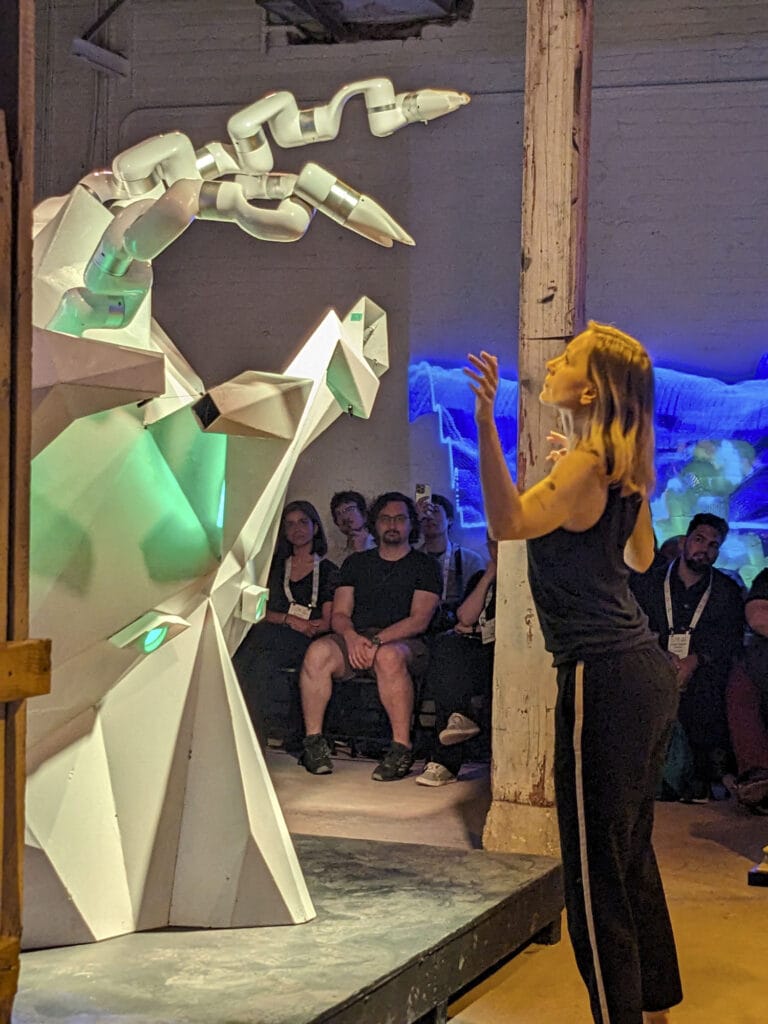 During the Rialto event, itinerant professional ballerina and quantum physicist Merritt Moore performed Machine Yearning. In this series of dances, she partnered with a robot, designed and built by Universal Robots, that was embodied as an articulated arm as tall as an NBA basketball player. The first piece featured a guest appearance by Atlanta Ballet dancer Jordan Leeper.