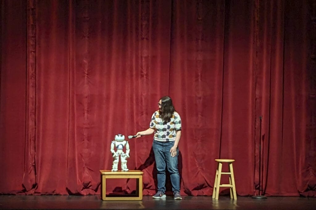 Next, Naomi Fitter, a stand-up comedian and associate professor in the School of Mechanical, Industrial and Manufacturing Engineering at Oregon State University, performed a skit with Jon the Robot. Jon is a pint-sized engineered comic who told computer-science-themed jokes while making remarkably human gestures, including hunched shoulders that signaled dejection or embarrassment, playful sidelong glances and arm waving for emphasis.