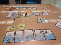 After discarding a dice mechanism, I went with hand management and card drafting — simple, flexible, and perfectly sized for the 19xx box.