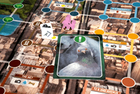 At the beginning of each turn, you roll a city or park die (depending on where you start from), which triggers a little mini event. Often it's nothing (just a little puddle) or a good thing (this is how you get dogs to poop!), but you might also roll a pigeon (in the city) or squirrel (in the park). Whichever direction the pigeon is facing on the die, your first movement must be in that direction. With only 3-5 movement points each turn, this can introduce exciting chaos to your turn. Don't like that? Bring treats with you to cancel the effect!