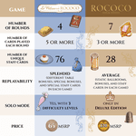 In La Pâtisserie Rococo, players represent the pastry shops (les pâtisseries) and pastry chefs (les pâtissiers) that are preparing pastries for sale and for show at the Versailles Garden Festival. Using the unique deck-building mechanism from Rococo, players hire staff to create recipes, acquire quality ingredients, and bake delicious desserts. Then comes the challenging decision of whether to sell these delectable creations for profit or present them for possible awards. The player who creates the most acclaimed desserts will gain fame and the respect of the king and his nobles.