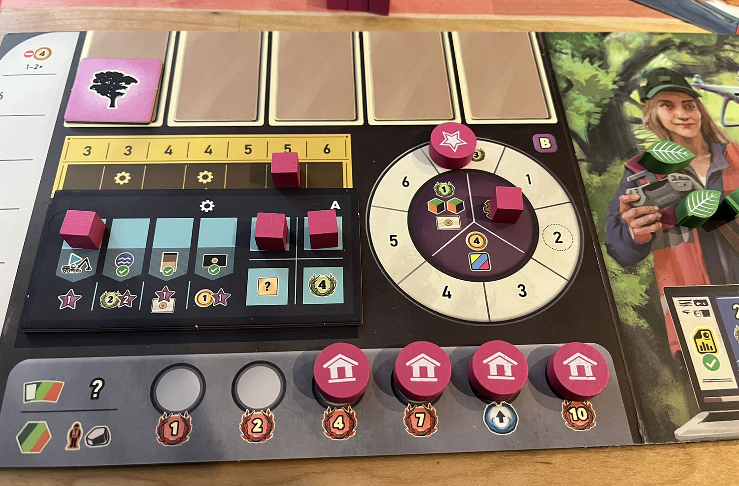 The good news is that while there are a lot of action points required to accomplish any given contract, there are also lots of ways to get some of these tasks done using built-in bonus actions found throughout the game, both on your personal player boards and on the main board. Many of these are single-use, however, so a key part of playing well is deciding when to trigger which bonuses for maximal effect. If triggered effectively, these bonuses can allow some great combo-tastic turns and completing 4+ contracts in a game. Of course, it helps that many contracts provide in-game bonuses like resources and money once fulfilled (in addition to points) that can save you some crucial action points. It often makes strategic sense to focus on simpler low-point contracts (like your starter single-tree contract) early-game and use their rewards to boost your resource reserves.