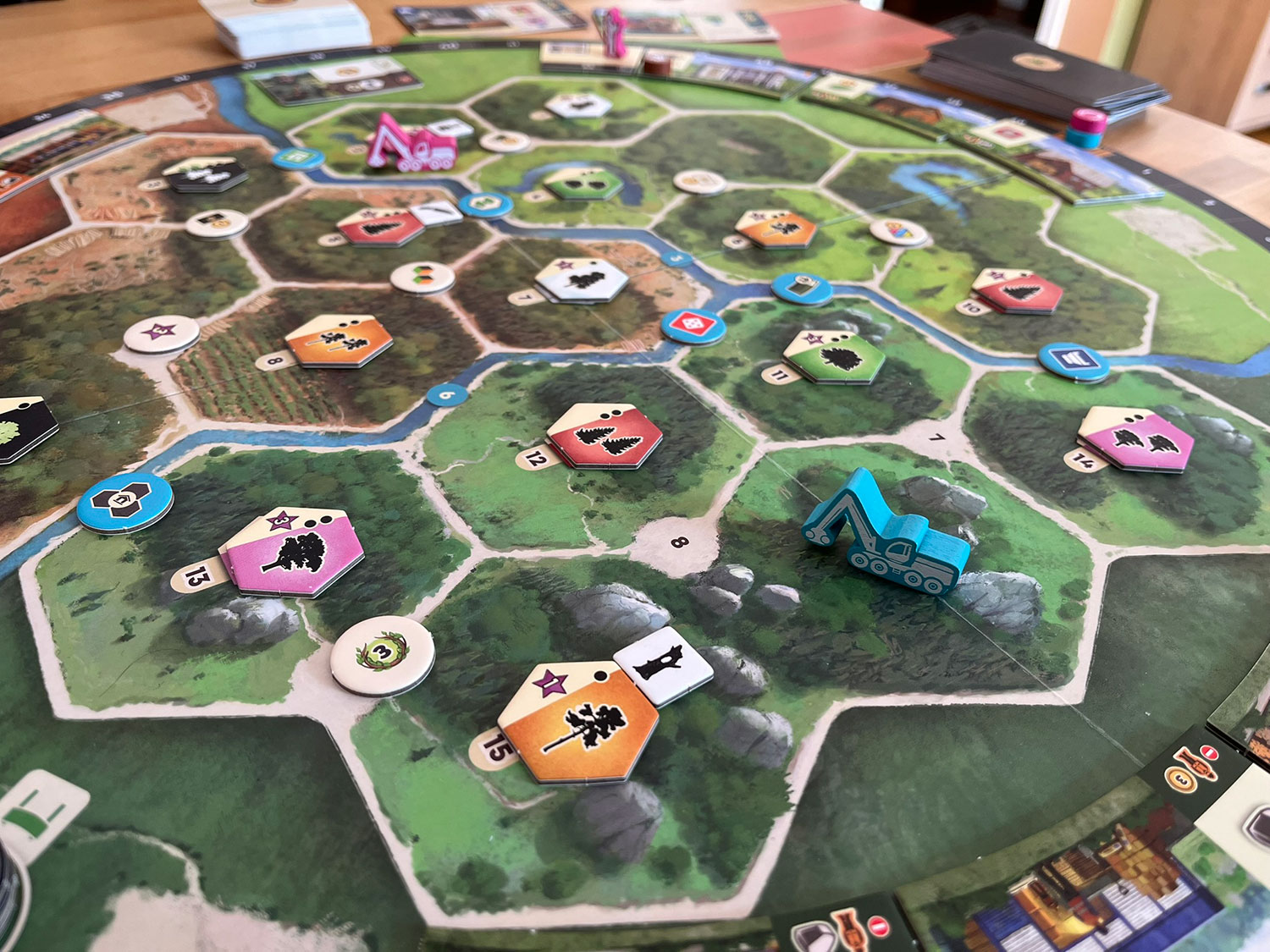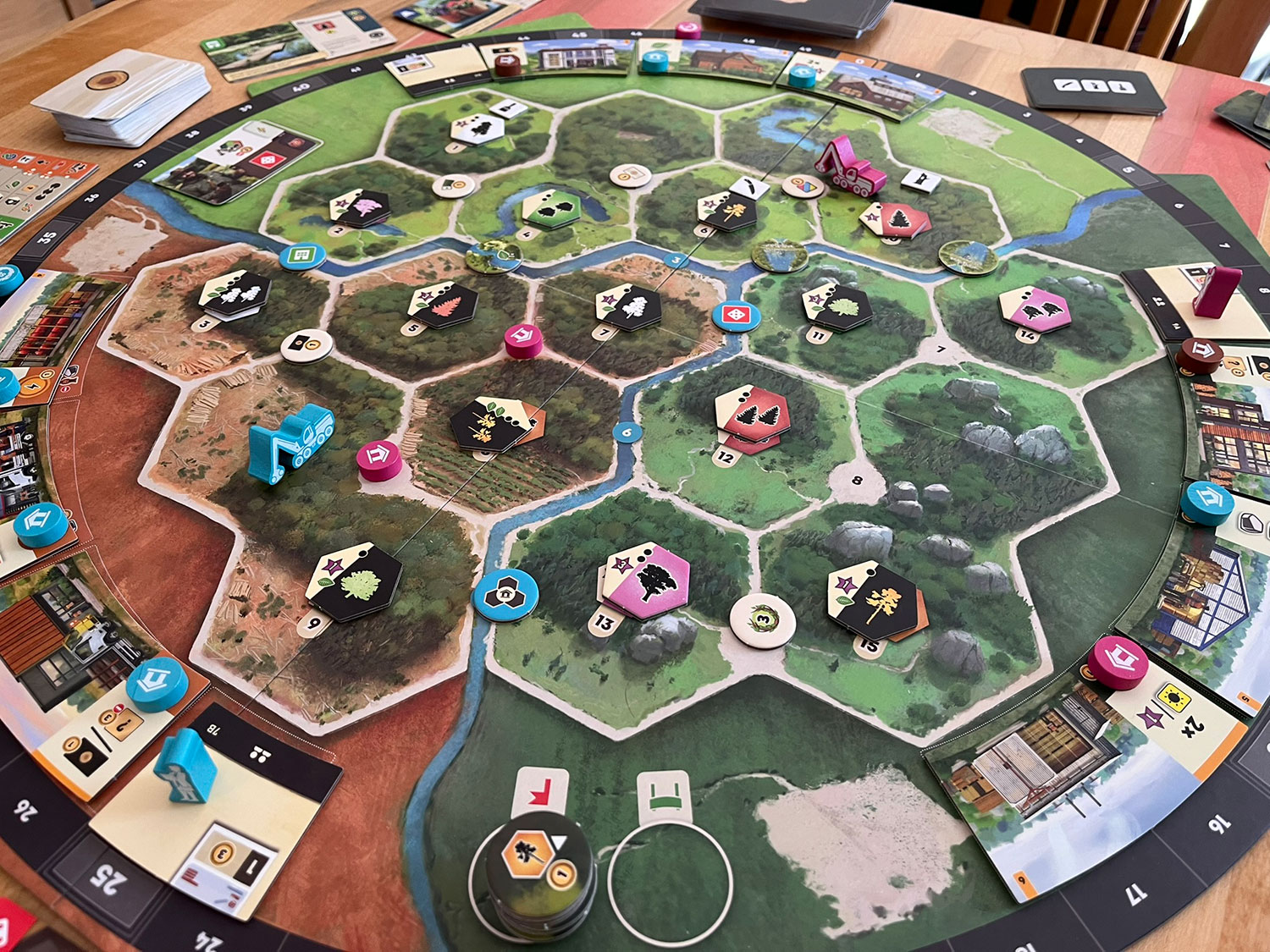 The central board at game-end for 2-players shows depletion of many forest regions (black-background hex tiles), as well as many upgraded sawmill rooms, and several newly constructed forest and water structures.Final Thoughts: