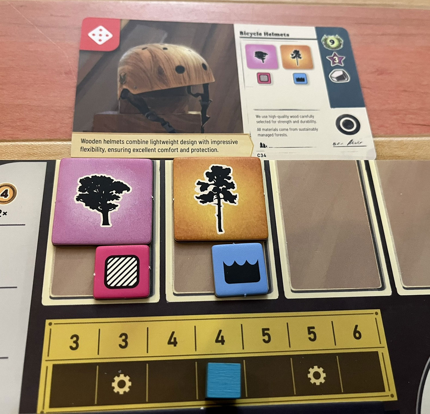 To fulfill this relatively easy contract for a bicycle helmet, both planed oak wood and pickled pine wood are required.The game is not just about fulfilling contracts, though. Two other game elements that provide major points are water structures and task cards. Both of these award points for fulfilling various types of tasks throughout the game, ranging from constructing buildings in specific locations, planting trees in certain forest regions, and performing certain amounts of tending operations. This is the type of game where you do need to do a little bit of everything to gain those timely in-game bonuses, but long-term strategy is often dictated by scoring opportunities you’ve reserved on contracts, task cards, and water structures, so prioritization of actions becomes more and more clear as the game progresses.
