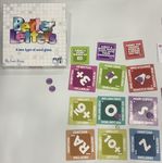 In the grid above, the word "SANK" would satisfy the four marked rules, and the player would score 6 points...except that all players mark all of the rule cards that they have used, and if more than one player uses a rule, then it's worth 1 point less for all of those players. If you use 5-6 of your tokens on a single word, you earn bonus points, which is also true when you play one of your two secret goals with a word.