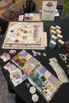 Tessen is a 2-6 player "dudes on a map" game from Ben Rosset and Matthew O'Malley in which players draft an action, add it to their tableau (to influence the impact of future actions), then carry out said action. Your goal is to be the first player to meet seven objectives, with you marking objectives on the game board as you achieve them.