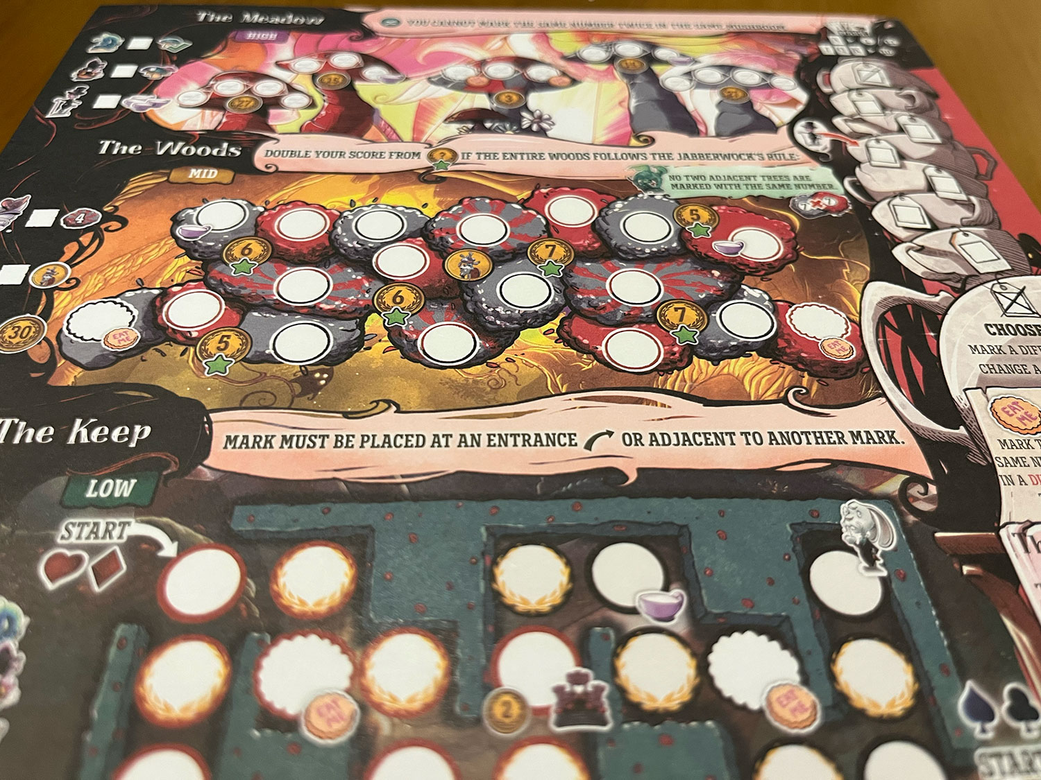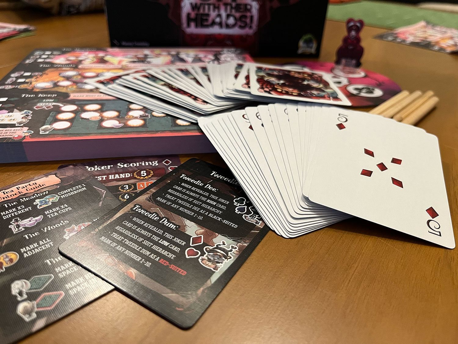 The cakes offer an additional wrinkle: use them to mark up to seven extra spots on your score sheet. In practice, if you’ve committed to a strategy (and you should), you’ll find fewer chances to exploit those combos. The Poker hand mechanic at the end of each round, while thematically fun to imagine the Knave of Hearts bluffing his way through a hand, feels a bit added on to the core experience.