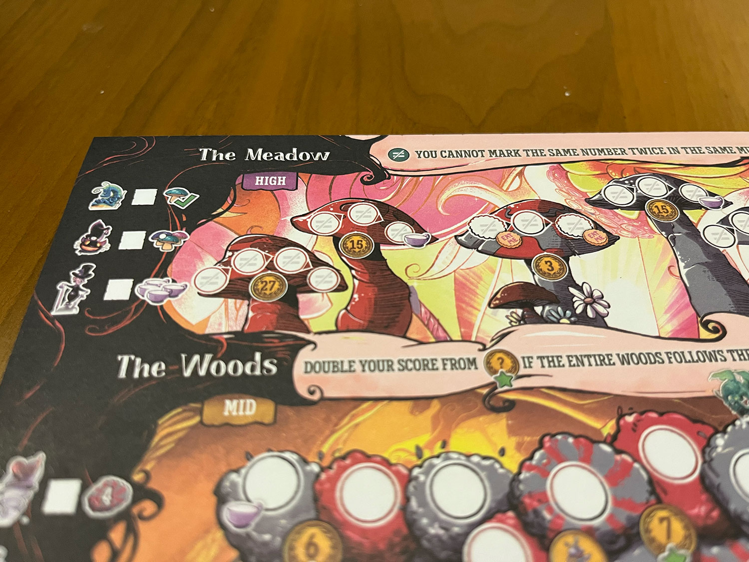 Trippy deck art oozes fanciful wonderland themeThe game is billed as a “reveal and write.” Over three rounds, 2-4 players compete across 7 bouts per round, revealing cards simultaneously, comparing ranks against the Queen of Hearts’ current position on the rondel. Her changing location on a rondel dictates the trump suit and whether you win a bout, lose, or fall somewhere in the middle. Your rank determines where you place your card’s value on your score sheet. Winning or high cards go in the mushroom woods. Middle cards take a spot on the meadow’s twisty path. Low cards descend to the maze-like keep.