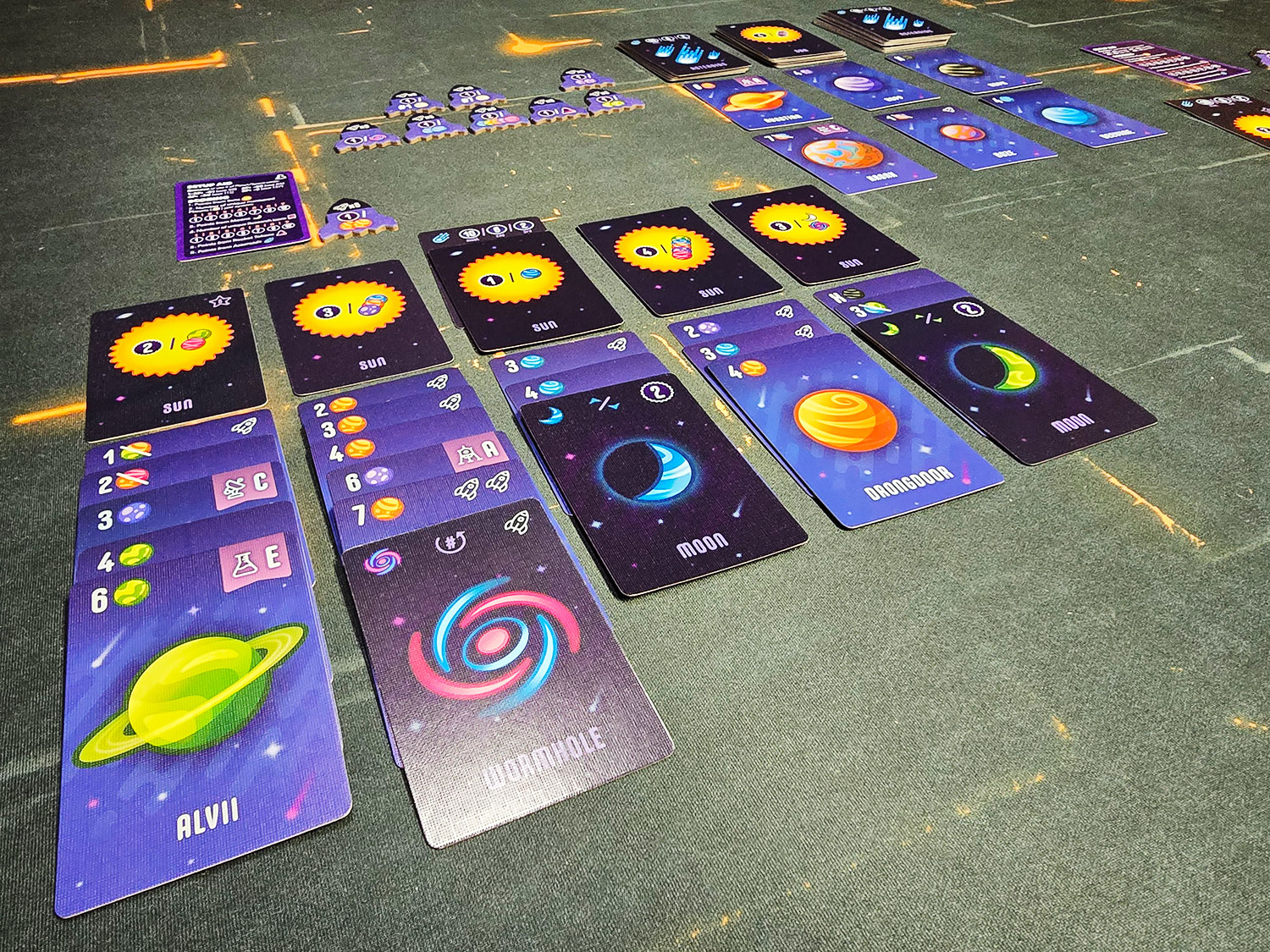 Moons are placed for points in your planet lanes. They score based on matching planet colors on top and/or bottom. Wormholes allow you to reverse the order of cards, though crucially, duplicate numbers still only count once for scoring.