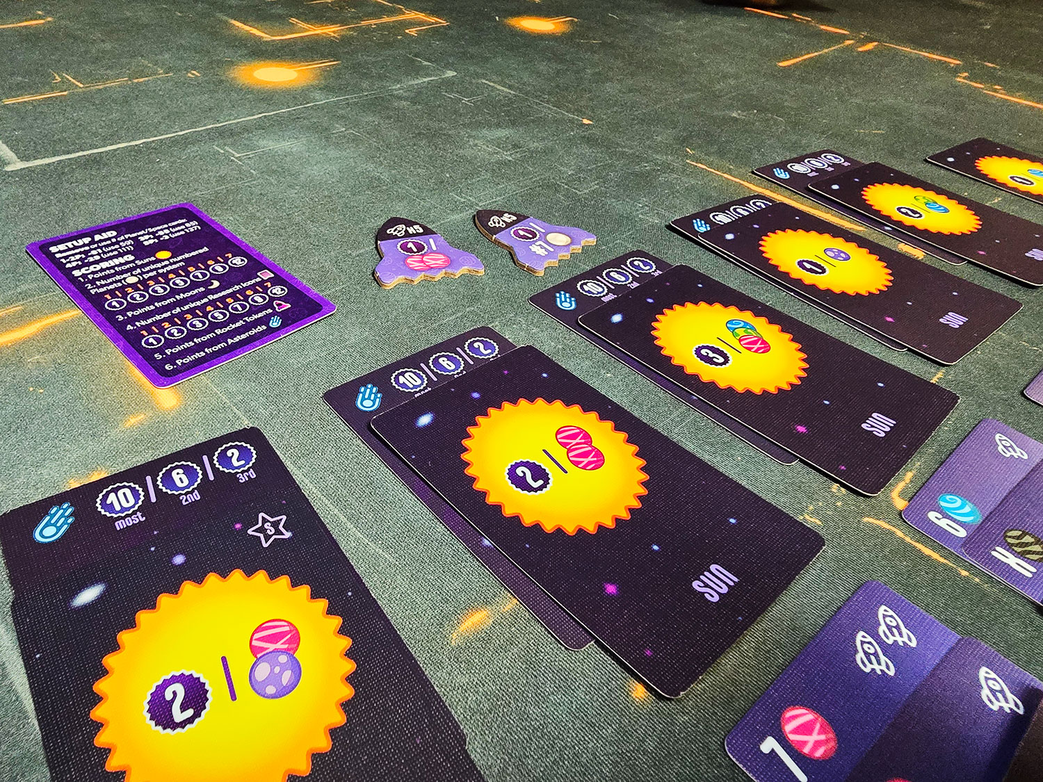 Suns have specific scoring conditions on them. 1 point per every 2 pink planets, 4 points for a set of 5 unique colored planets. Etc. Each planet has a number, and numbers must stay ascending or descending as you build the lane out.