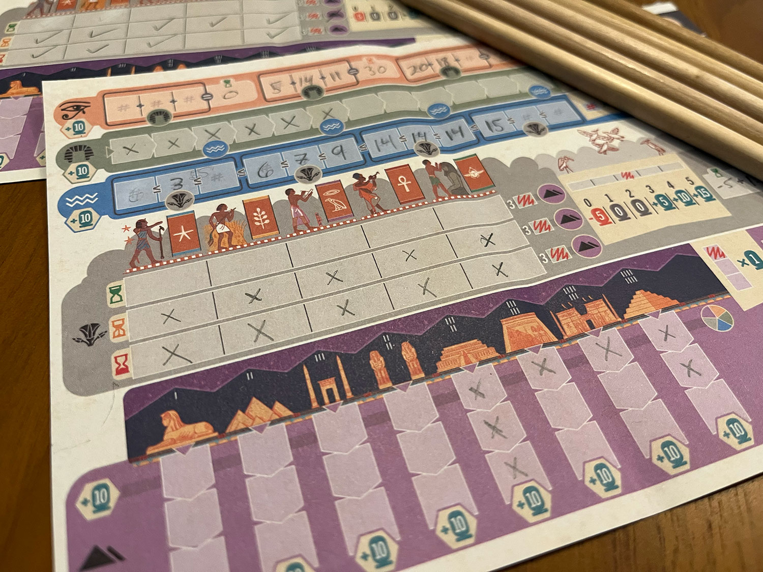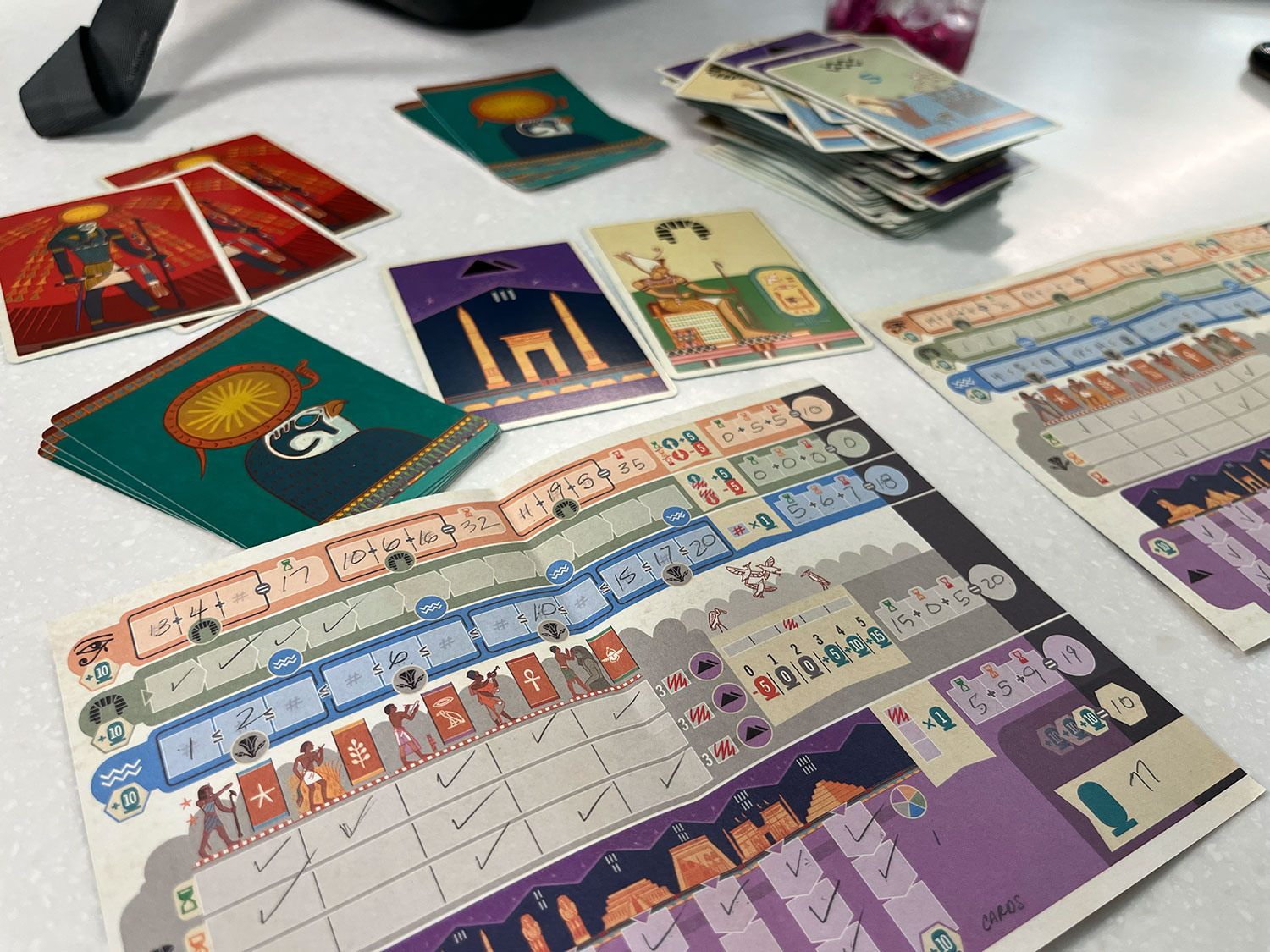 Great art and iconography on the cards. These cards reveal opportunities to score along the Ra and Civilization tracks.I was surprised to find a steeper learning curve than expected. It took us most of a play-through to fully grasp the strategic implications of our choices. The score sheet requires some time to parse, though veterans of the original Ra will find this easier. Once you understand how to leverage civilization and monument cards while maintaining balance across other tracks, a dominant strategy begins to emerge that can flatten repeat play.