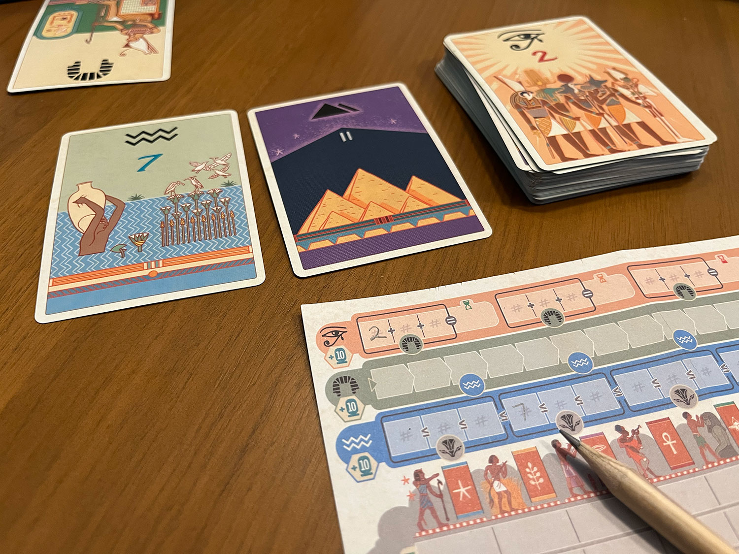 Revealed cards score along each track, but once three Ra’s have been revealed, it’s pencils down.Gameplay Experience: