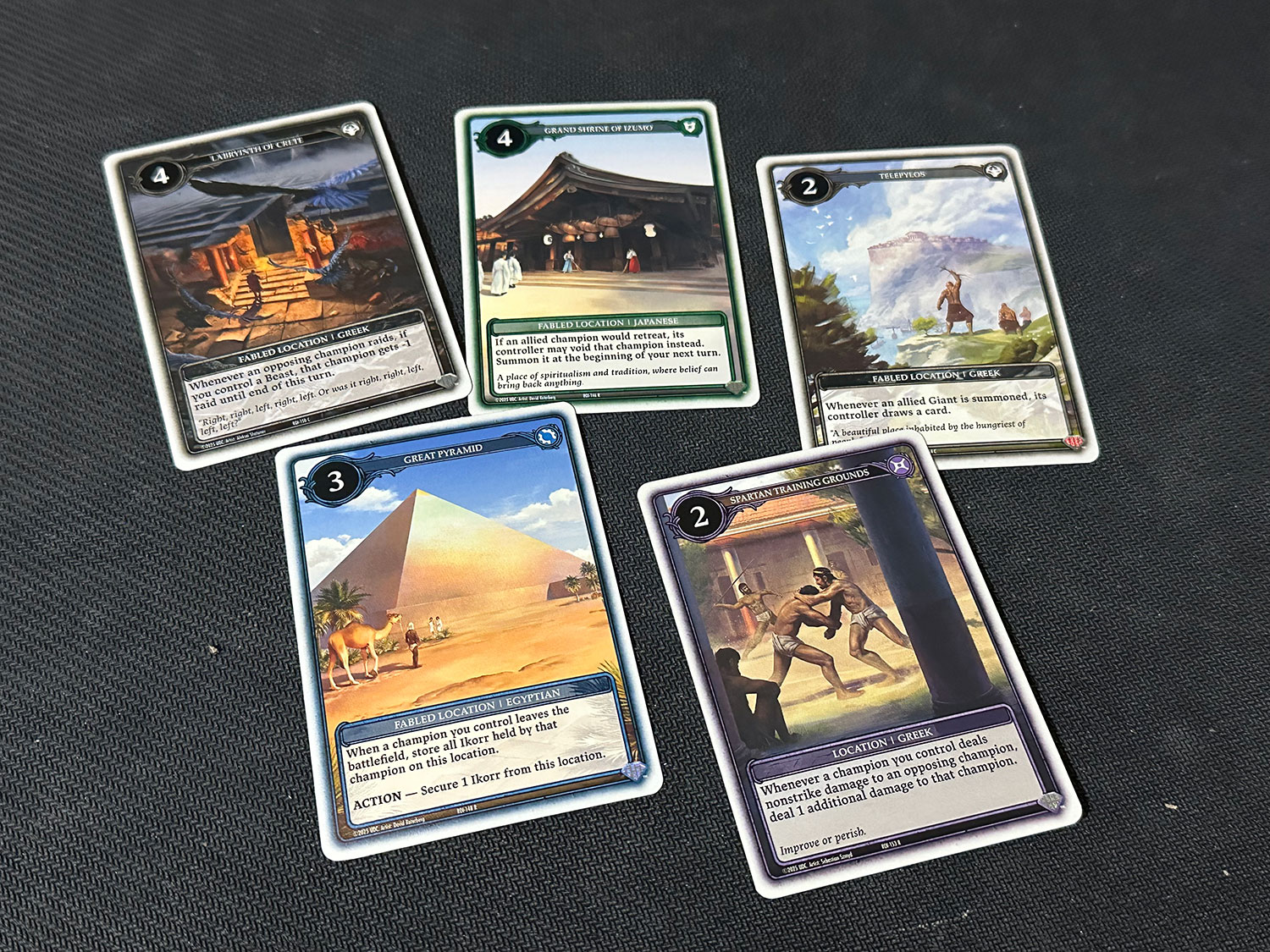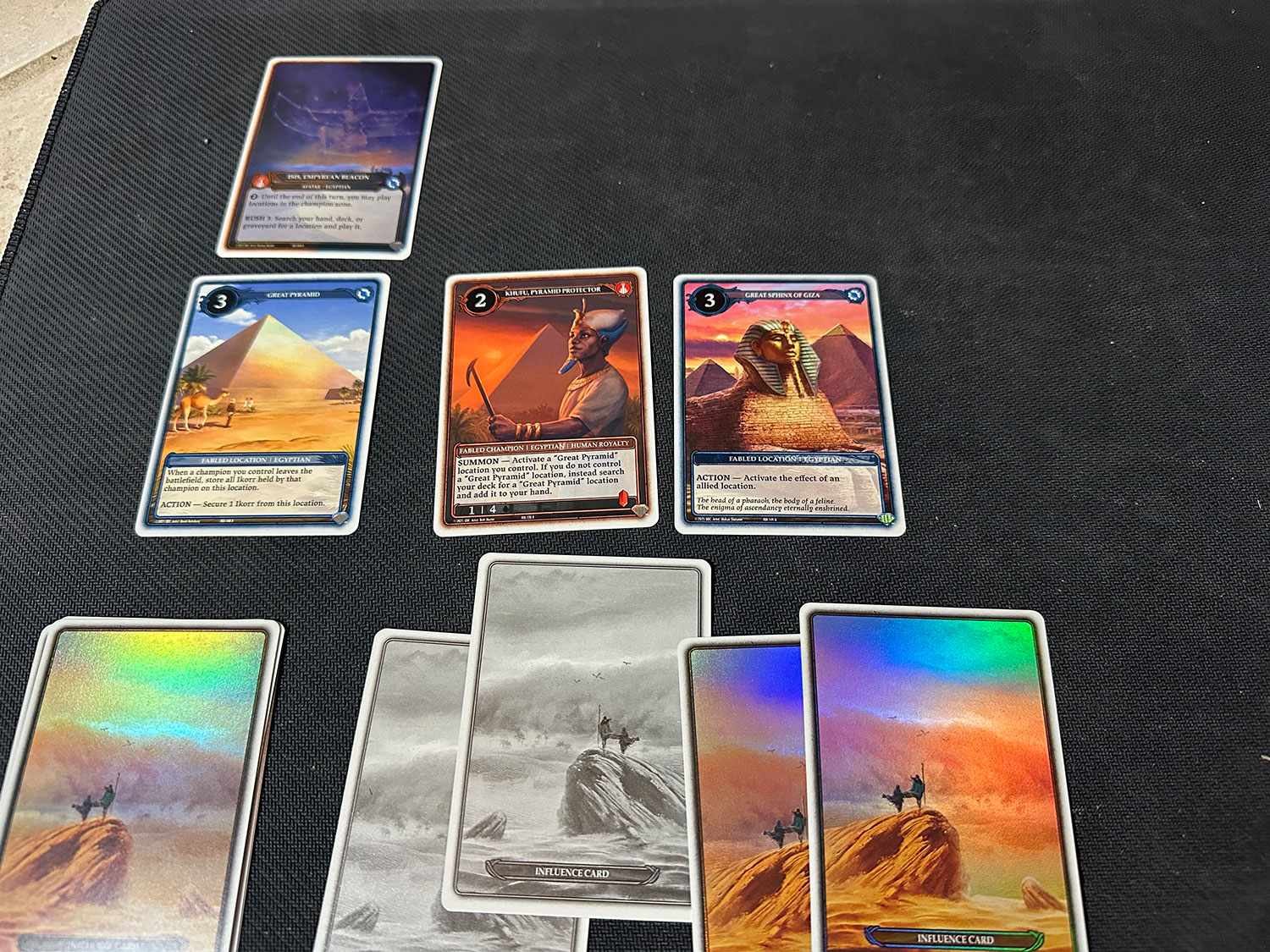 Champion cards are the core of gameplay and many are recognizable faces from history or mythology. From mortals of legend like Achilles to real-life royalty like Ramses the Great to gods like Thoth, there are many allies in your quest to control the Ikorr.This makes it very much a game of managing your resources. Powers that require destroying Ikorr can be a big swing, but they can also be a significant setback. You have to balance them with the other key aspect of the Action Phase: Champions. The various Champions can be everyday generic characters like an Egyptian Accomplished Architect, or they can be a unique character like Imhotep. They are used for both attacking and dealing damage to opposing Champions, or for raiding to secure Ikorr. They can only do one or the other in a given turn. Some are better at attacking, some are better at defending, and some are better at raiding (not every Champion is able to raid). Though Champions are the most important cards in your deck much of the time, there are also Spells and Locations, rounding out the types of cards you can find in the game. Spells are one-shot effects that are discarded after being played, and Locations are ongoing effects with activated abilities (though you can only have one in-play at a time!).