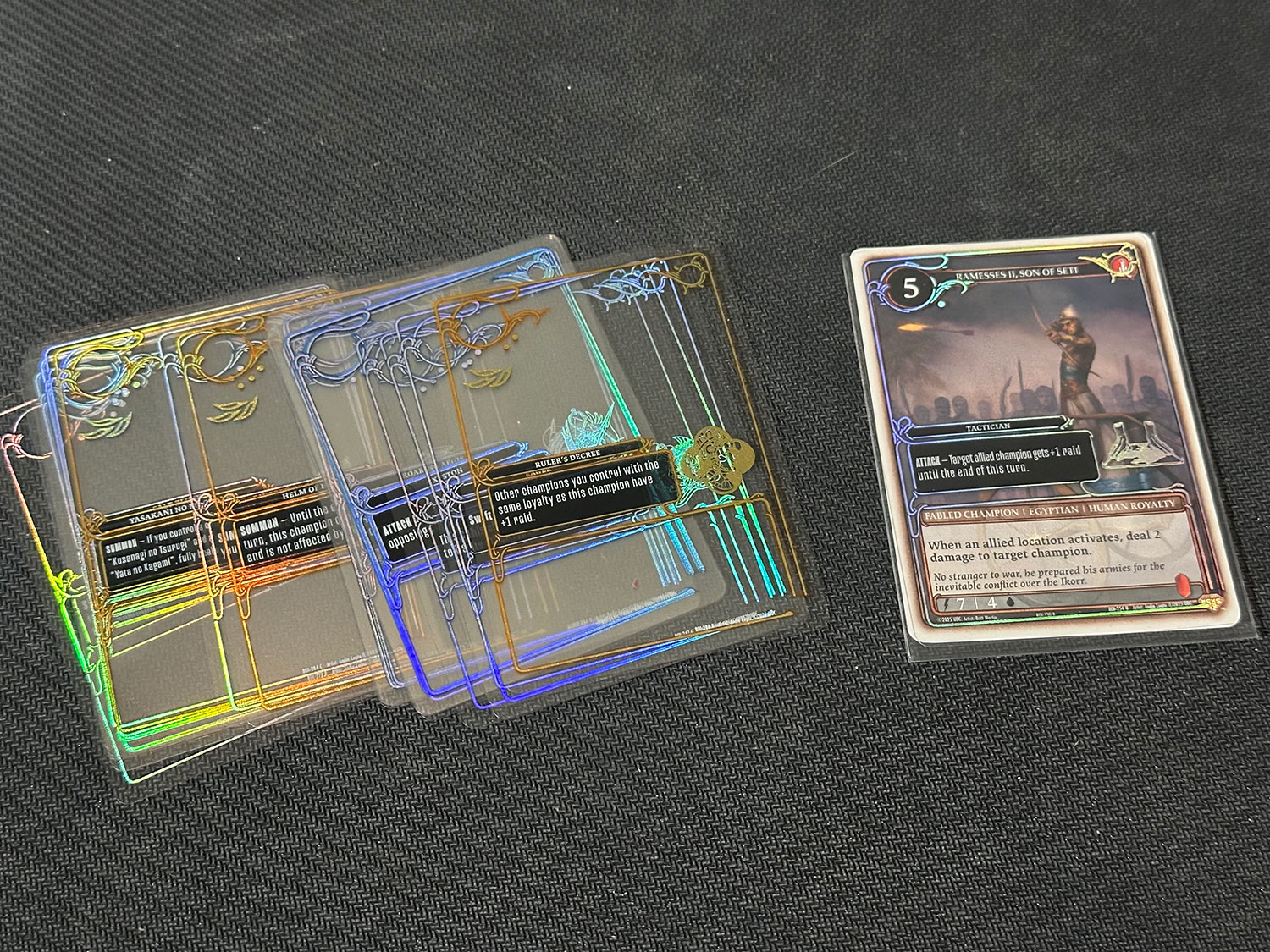Like any modern TCG, Rush of Ikorr has cosmetic variants hidden in packs: foils, alternate art cards, or even some borderless cards.Like many other TCGs, the turns are broken up into phases. Each turn consists of a Start Phase, Draw Phase, Action Phase, and End Phase. The Start and Draw Phases are automatic actions. You gain any Ikorr your Champions collected your previous turn, gain an Influence from your Influence deck (this is the resource that you use to play cards. You gain 1 per turn to a max of 10 in a very Hearthstone-y fashion), and draw 1 card from your deck. The meat of the action takes place during the appropriately named Action Phase, when you have most of your strategic decisions to make regarding playing cards, using activated abilities, deciding which Champions to attack with, or raiding for Ikorr. The End Phase is just a time when some abilities will trigger.