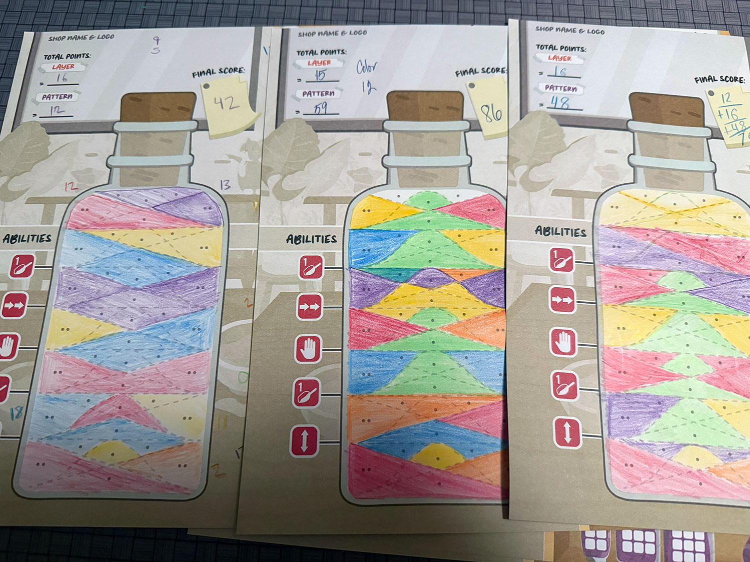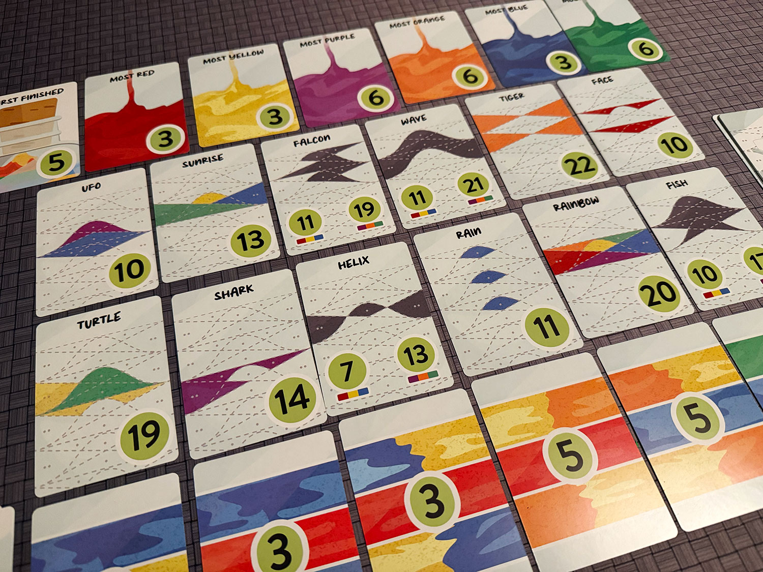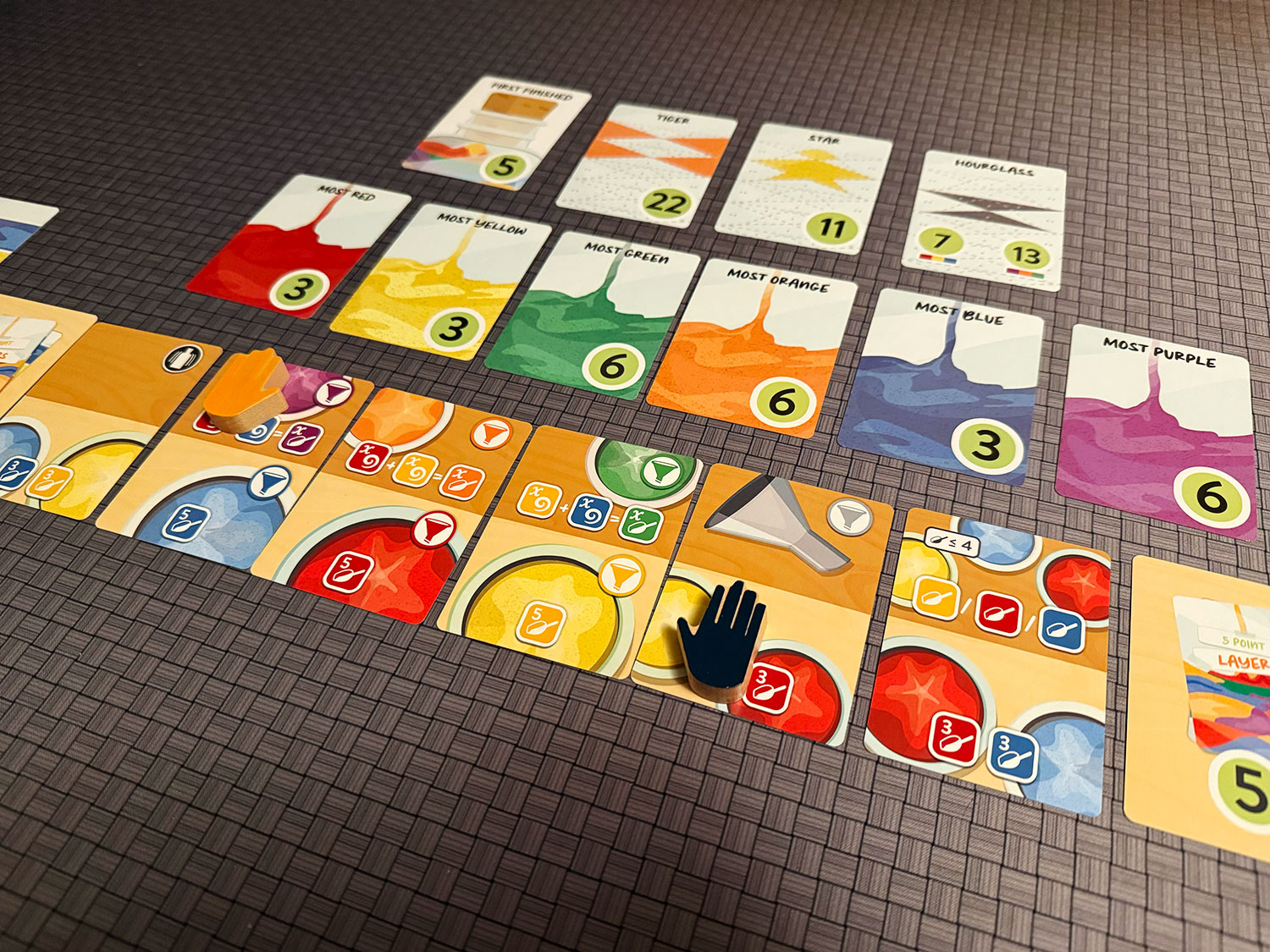 The game continues until someone finishes their bottle, gaining the first finished card, and then the game ends after each player has had the same number of turns. Points are scored for patterns, matching layer cards that have been picked up, and color objectives which reward points for having the most of each color. Highest score wins.