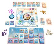 In this game, players maneuver their birds to ideal starting points for their great migratory journey, whether that's at the front of the flock or nestled somewhere amongst their companions. To set up, shuffle three birds for each player with three neutral birds, then place them at random on the rows of the game board.