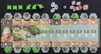 The swamp starts with a scattering of spirit spaces on it, along with five temples around its perimeter. You and your fellow clans have twenty settlements ready to establish in the swamp, three of which will start the game on the board, giving you two boats with which to sail the swamp. You have three critters on hand with which to take actions, with two more and a third boat that can be unlocked during play when you place the associated settlement tile.