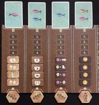 ▪️ Trade: For each boat, move it up to your maximum sailing distance, then place fish from your supply onto adjacent settlements, earning $2-4 per fish from the bank if the settlement is owned by an opponent.