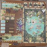 The image above shows two of the asymmetrical player boards, although I'll confess that the asymmetry seems somewhat mild to my untrained eye. The blue player, for example, can unlock a sixth critter, so they kind of have a tool that can unlock anything on the action spaces, whereas the yellow player has five tiles that they can add to their board as they wish, which also gives them the ability to adapt to the current board situation. Green can earn far more mana income than anyone else, and two mana = one neutral worker = a bonus action, which is kind of on par with blue and yellow, although you might also need the mana to pay action costs that others can't afford.