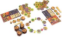 On a turn, choose a fruit marker on your player board, lower it by one space, then collect the two landscape tiles surrounding this marker in the market. Add these tiles to your board, then choose one of your face-up harvest tiles and add it to your forest. Each sickle on the harvest tile adjacent to a landscape tile earns you one fruit of that type for each tile in that fruit group, e.g., placing a sickle next to avocados in a connected group of four tiles will raise your avocado marker four spaces on your player board.