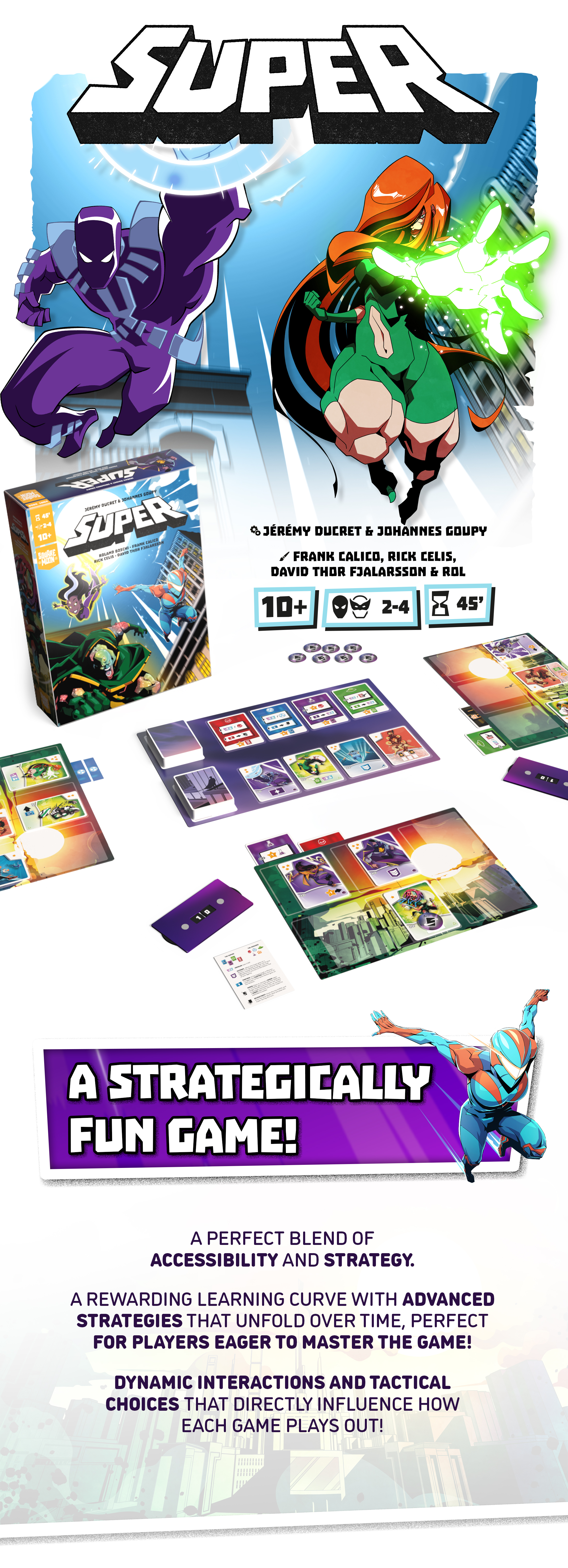 What if superheroes weren’t just crime-fighters, but social media influencers? SUPER is the board game where fame is the ultimate superpower, and managing your superhero agency to gain the most followers is the key to victory!