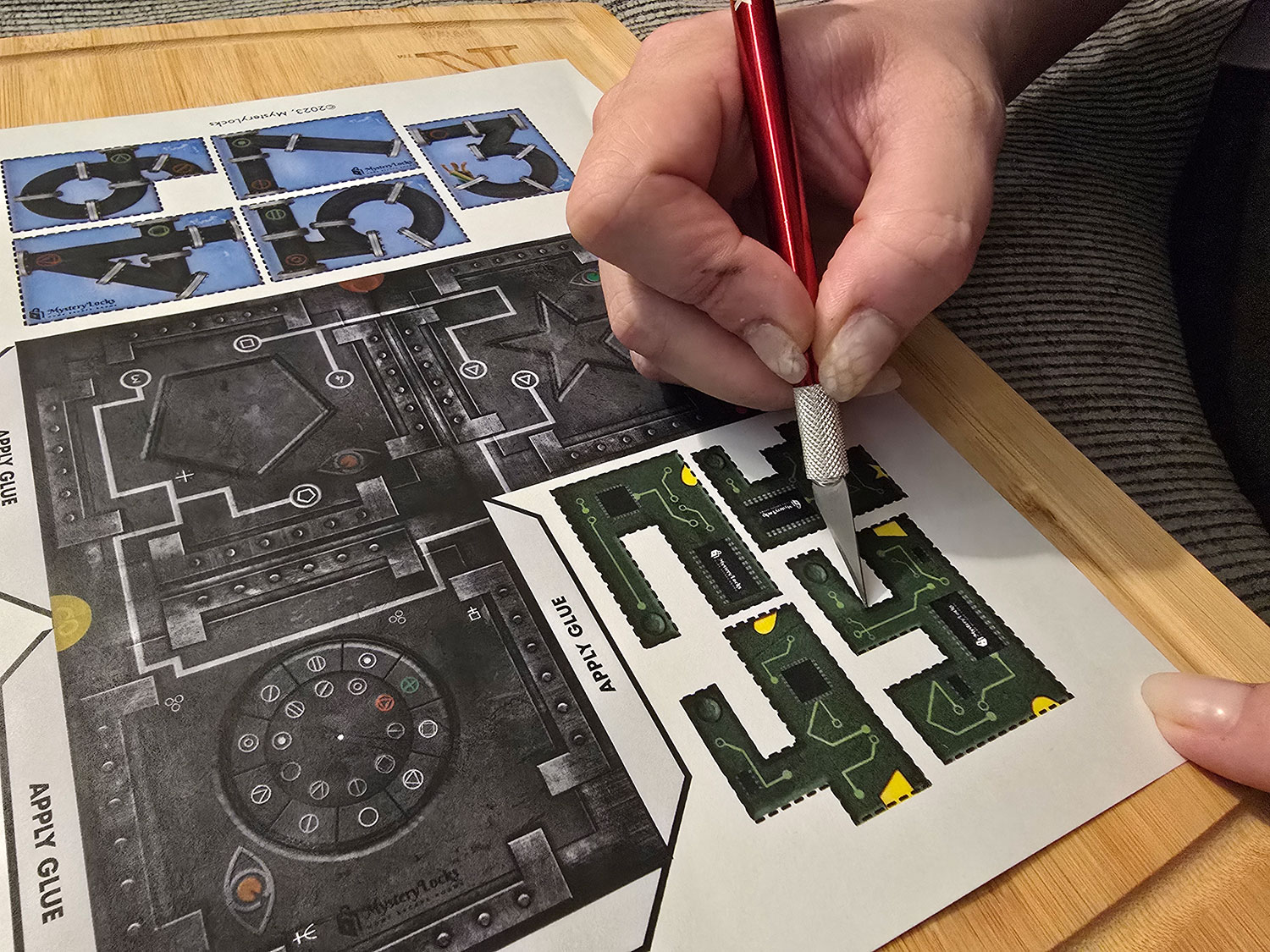 After printing, you’ll need to cut out and assemble your puzzle box and various bits. This took us about 45 minutes. A regular pair of scissors works for the most part, but we did grab the Exacto Knife for some of the tiny bits.