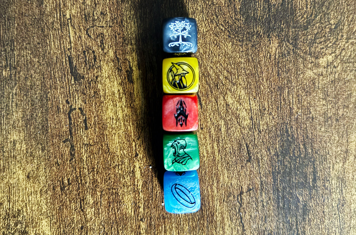 On each turn, you roll all of the dice of each color over and over until there are either none left or you roll a Tree and can stop. With each roll, you have to take at least one die out of the pool to keep and lock in. If you roll any Nazgul, you must lock in at least one of them, and the player the dice color belongs to has to mark another box off along the Nazgul track on their own sheet.