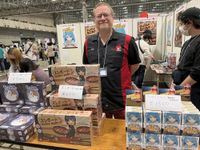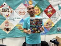 Saashi holding his new game at the Saashi & Saashi booth; their demo tables were always full
