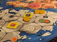 I tried my best to pretend I was the purple player (purple being my favorite color) and to pretend that the yellow player was my hated rival. Still, I always gave yellow the benefit of the doubt, taking chances to stab the purple player whenever I had the chance. When yellow was the first player at the end of a round (turn order changes only between rounds), I always tried to block purple from getting the best bonuses, the technology upgrades, or the symbols they might need to build new population centers in a future round.